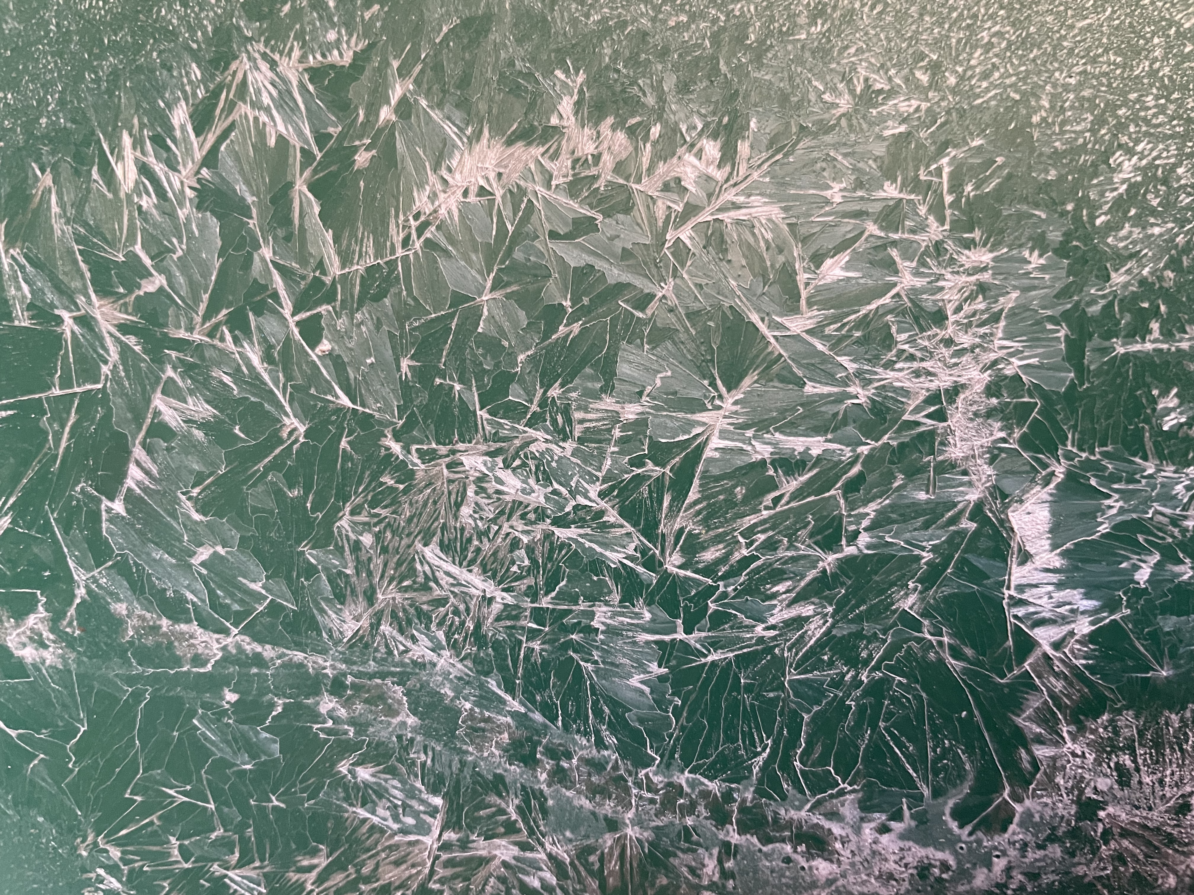 With the practical ice shots in place, we turned to computer-generated effects to help further the look where necessary. Developing this process ourselves, we tried many methods for digitally creating ice, but had to find a balance between achieving the effect and not overly obscuring the image underneath. While we tested a number of different methods for this technique, we quickly learned that the highly refractive nature of ice makes image distortion to photographs pinned under frozen cracks a fine-detail kind of job!