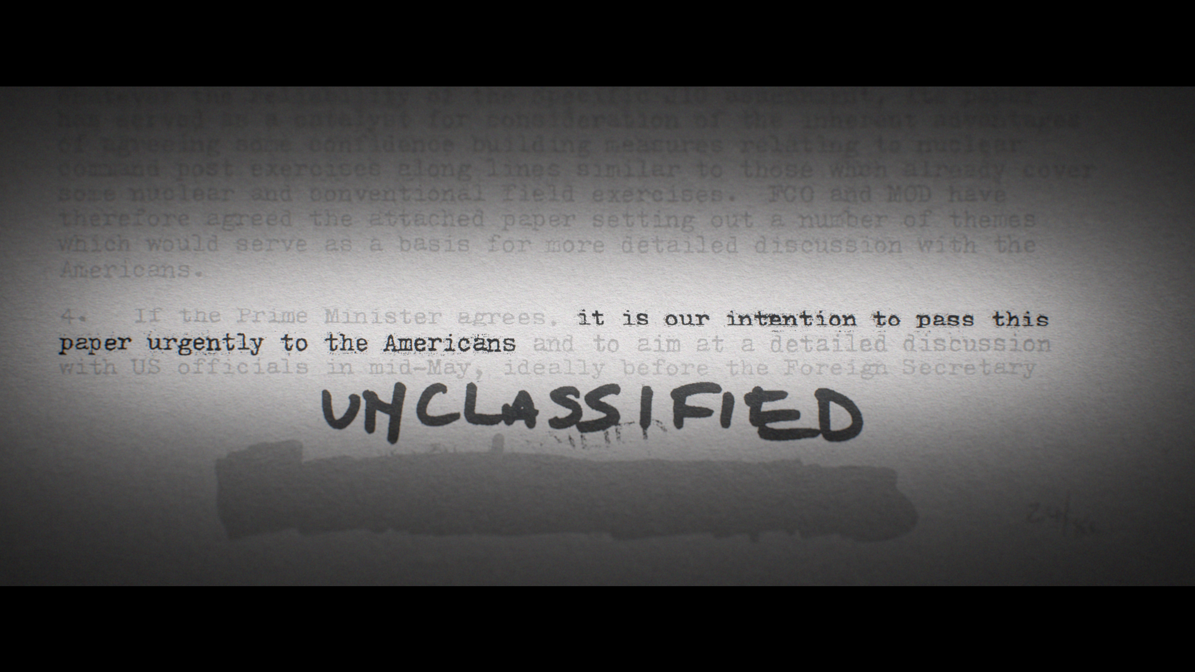 The Cold War: An intense time of geopolitical conflict, with global stability in a constant state of chilling and thawing. We wanted to represent this in the Main Title sequence with a freezing effect that overtakes historical imagery. From the creation of the nuclear bomb, through key moments in the decades-long tension between America and the Soviet Union, ending with the recent conflict in Ukraine, the sequence shows many important moments. Though it could have taken many forms with all the iconography of the era, through research and testing, we chose imagery that visually reflects the passage of time, and displays the thought-provoking content of the series. The entire sequence is encased in ice, though as history progresses, we leave the frozen past of WWII behind as the conflict re-escalates to become increasingly "hot" again. The ice begins to melt, water droplets form, the imagery becomes unlocked, and the weapons of war begin to reheat.